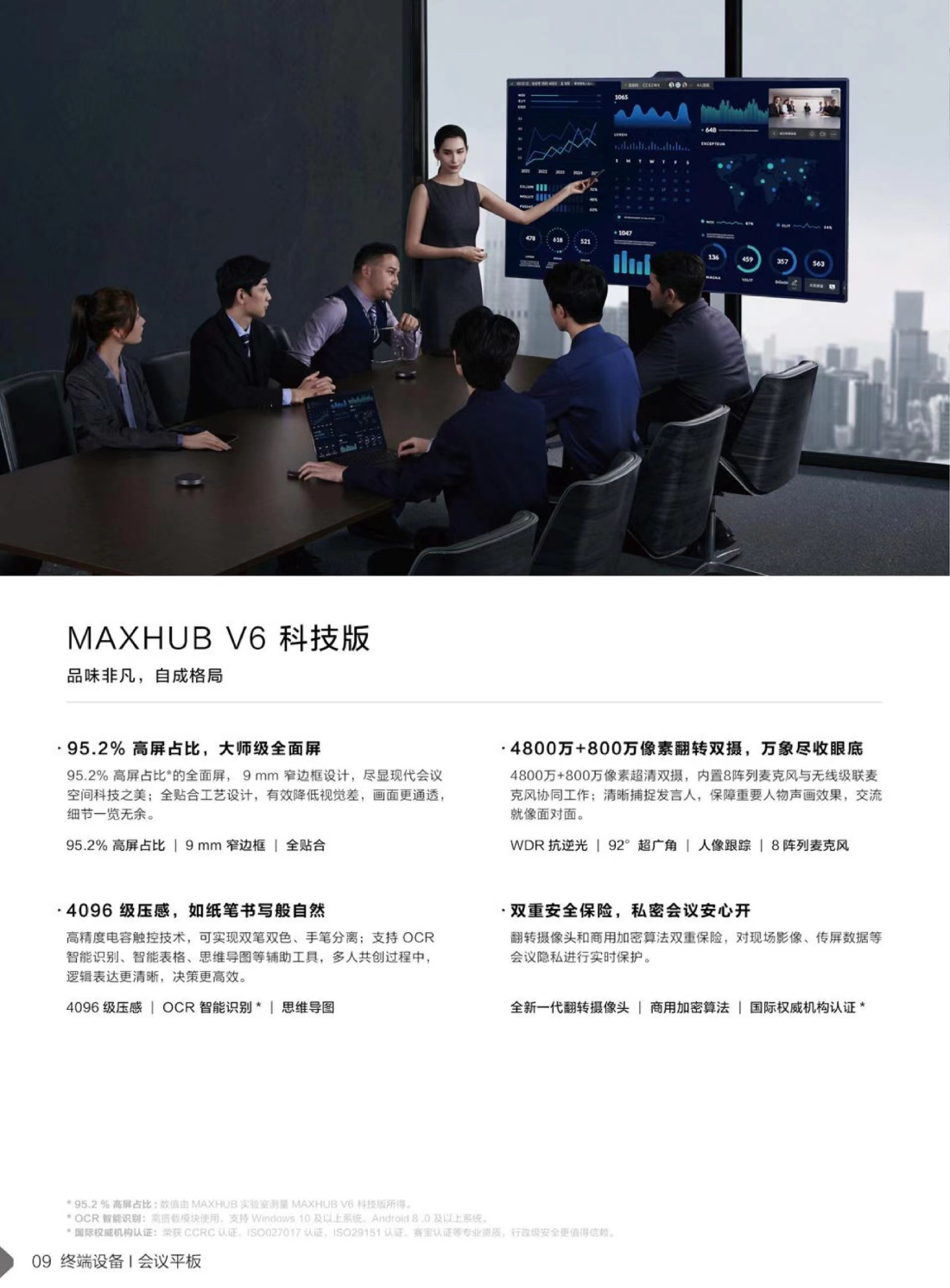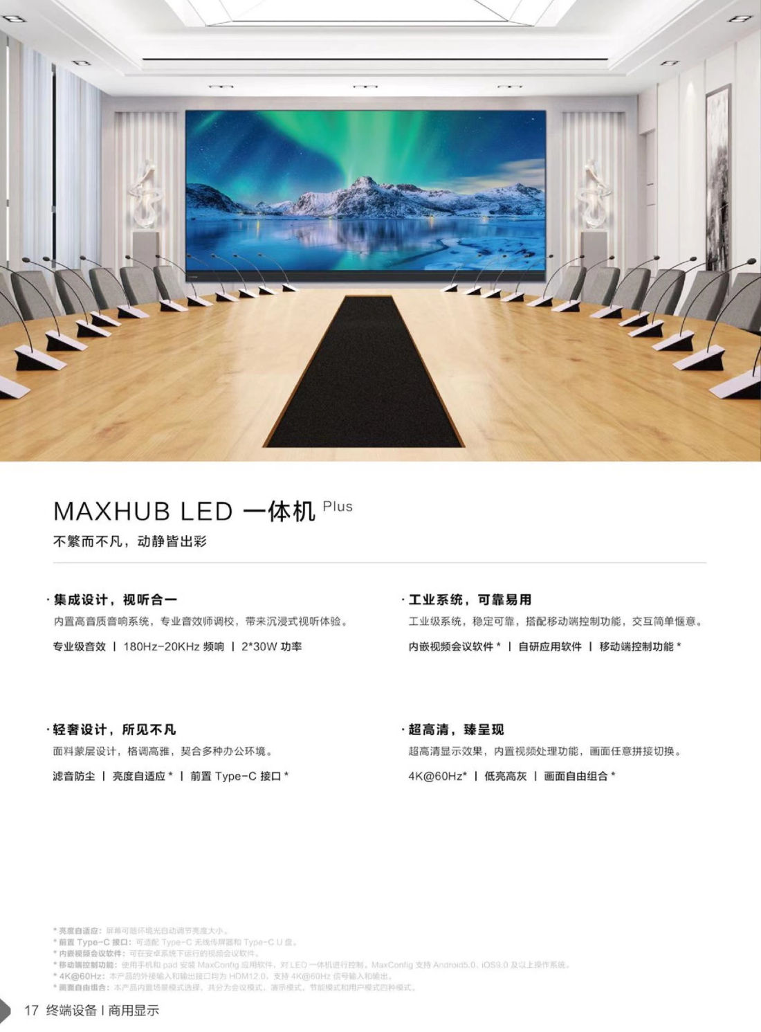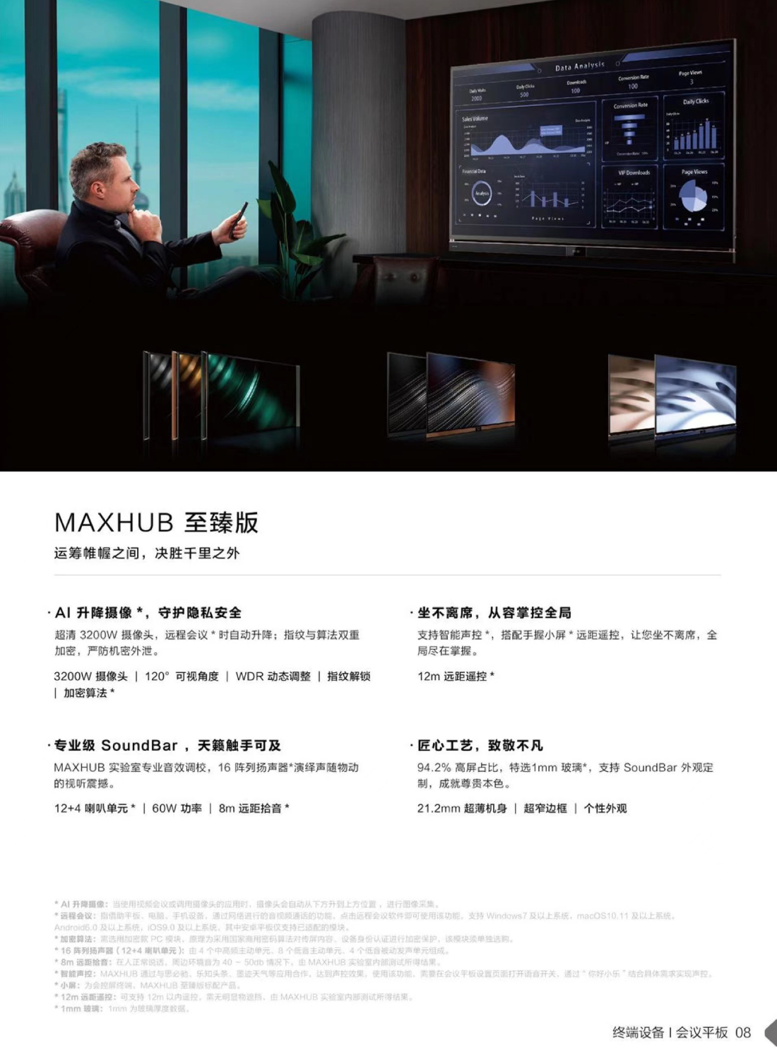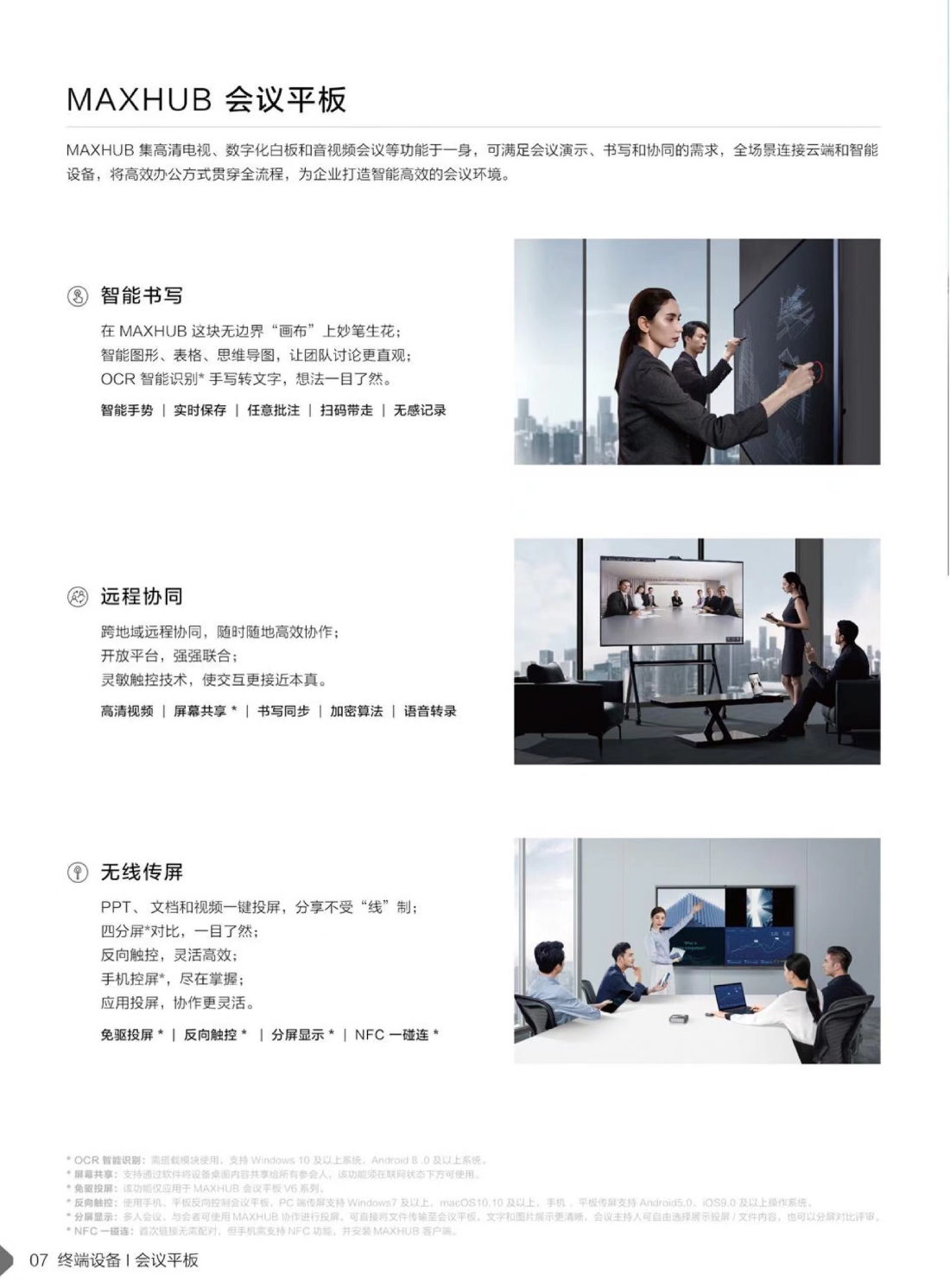 MAXHUB是視臻科技的自主*,誕生于2017年,是國內(nèi)會議平板品類的開創(chuàng)者和引領(lǐng)者,來自第三方奧維的數(shù)據(jù)顯示,2022年MAXHUB銷量市占率達(dá)28.8%。截至目前,MAXHUB已成功走進(jìn)全球78個(gè)*,超50萬間會議室都能看到MAXHUB的身影,超80%中國500強(qiáng)企業(yè)都在使用MAXHUB提升會議和協(xié)同效率*。 創(chuàng)新成就更多可能,MAXHUB持續(xù)根據(jù)用戶需求迭代升級技術(shù)和產(chǎn)品。2023年,MAXHUB首度在行業(yè)內(nèi)定義三大空間,發(fā)布三大空間數(shù)字化解決方案,以覆蓋全場景的協(xié)同終端新品,為組織帶來更高效的會議辦公體驗(yàn)。 服務(wù)無止境,滿意無終點(diǎn)。MAXHUB始終堅(jiān)持以“用戶為中心”,擁有完善的售后體系,2000個(gè)售后服務(wù)網(wǎng)點(diǎn)和10000名官方認(rèn)證工程師,為全國用戶提供設(shè)備咨詢、送貨、安裝、培訓(xùn)、維修等*專業(yè)服務(wù),對 于一、二線城市,還提供48小時(shí)內(nèi)上門服務(wù),真正做到“只要有MAXHUB的地方,就會有 MAXHUB的服務(wù)”。 打造更好的產(chǎn)品,追求更高的品質(zhì),提供更優(yōu)的服務(wù),MAXHUB將致力于提升協(xié)同共創(chuàng)的效能,把高效轉(zhuǎn)化為企業(yè)的核心生產(chǎn)力,為社會創(chuàng)造更大的價(jià)值。